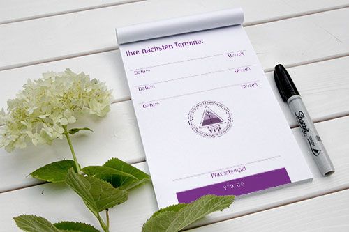 Zum einfachen Praxisstart erhalten Sie 2 Terminblöcke DIN A7 mit je 50 Blatt. Diese können auf der unbedruckten Rückseite mit Ihrem Praxisstempel versehen werden. Nachbestellungen sind im internen Mitgliederbereich möglich.