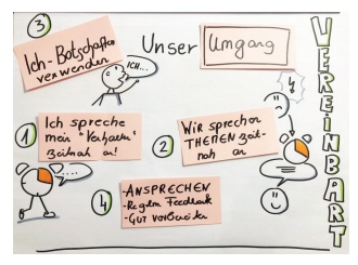 Im anschließenden Teamgespräch konnten durch diese Visualisierung die Mitarbeitenden das Thema nachvollziehen, die gemeinsame Geschichte wurde weitergeschrieben.
