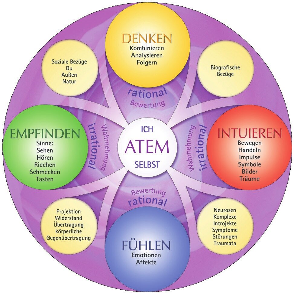 Auch haben mir die Atemübungen von Prof. Ilse Middendorf die Unterscheidung zwischen Empfindung und Gefühl gezeigt. Eine reine Empfindung ist eine spürbare Erlebnisreise, z. B. heiß – kalt, weit – eng, prickelnd – brennend und ist auf den Innenraum im Körper bezogen. Ein Gefühl ist immer Teil unserer Vorgeschichte, also bewertend. All das als Empfindung und Fühlen Beschriebene entspricht den Bewusstseinsfunktionen nach C.G. Jung (Abb. 1). Aber der Weg vom unbewussten zum bewussten Atemerleben in den fünf Räumen (unten, mitte, oben, außen, innen) über die fünf Sinne führt uns auch zur Beziehungsfähigkeit und zum Kontakt mit unserer Umwelt.